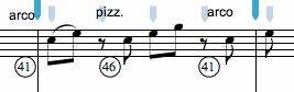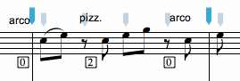 To add patch changes at any time in your score, use the command p# (where # is the desired patch number) and click near the staff at the beat location you want the patch change to occur. The patch change appears on the score as a small number in a circle. These patch numbers can be moved freely around the score, but they will always apply to the staff they are closest to at the beat location they appear. Patch changes are useful for switching between pizzicato and arco in DLS instruments as in the example below.