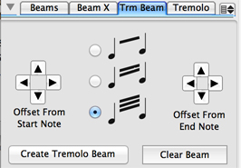 If you want to offset the beginning or ending position of the tremolo beams, use the arrow buttons to adjust the beam position. If you want to remove a tremolo beam, select the first note of the note group and click on the Clear Beam button.