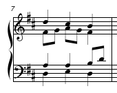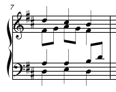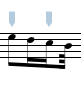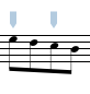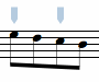 The Stem Length arrows are used to adjust the stem lengths of selected notes, so that they are drawn shorter or longer with each click of the arrow. The stems of all selected notes are altered whether they have flags or beams attached to them. The example below shows a score passage followed by the same passage with shorter stems, then the same passage with longer stems.