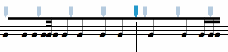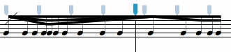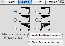 The Beam X tab view contains controls to create and modify feathered beams. Feathered beams are beams that are increase or decrease the number of beams across a series of notes and that represent rhythmic accelerandi or ritardandi. In other words, if you want to represent a gradual increase or decrease in rhythmic values across a beamed group then you may want to use feathered beams.