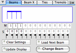 When the Change Beam button is clicked, the selected beam group is altered in the score and the next selected beam is loaded into the Beam pane ready for editing. Note that the rhythmic positions of the notes are not altered, only the appearance of the beam.