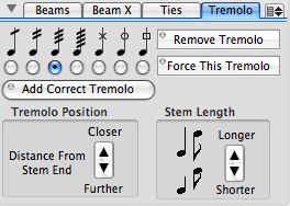 The Tremolo tab view contains controls for adding tremolo slashes to notes and for adjusting the stem lengths of notes.