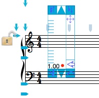 You will also see that the entry cursor contains some shortcut buttons for adding sharps (top-left) or flats (top-right), for inserting a rest (bottom-left), for undoing the last change to the score (bottom-right) or jumping back to the previous cursor position (above the undo button). As well. the tall rectangle at the right side of the Entry Cursor can be used to drag the Entry Cursor to a new location on the page.