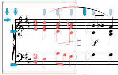 In order to perform any editing operation in NoteAbility, you must first select the images that you want to alter. Use the Select Image or Select Score tool to make your selection. Selected images are redrawn in gray to show you that they are selected.