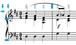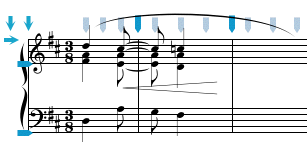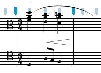 The Insert operation (invoked from the Edit menu) inserts the copied or cut data at the Entry Cursor after first shifting all the music from the Entry Cursor through to the end of the score to the right in order to make room for the paste. In calculating how much room is needed for the new music, only notes and rests are counted, and the music is shifted so that no overlapping will occur between the pasted notes and rests and those already in the score. If the following passage is copied, a total of three beats is calculated (even though the second staff only has two beats).