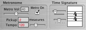 The time signature for the metronome is set in the same fashion as the time signature is set in the Document setup - with sliders for the setting the numerator and the denominator. The metronome volume, tempo, and number of pickup measures can also be set. The metronome will only play if the M.M.On box is checked. During recording and playback, a metronome flashes on every beat and the current measure and beat are displayed.