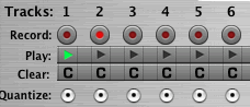 The 16 tracks have buttons for record, playback, a button to clear the track and a button to indicate whether or not the track should be quantized (either after a new recording is made or when the Re-quantize button is clicked.) You can record in only one track at a time. In the example above, track 1 has already been recorded, and the user is now playing track 1 while recording on track 2. To clear a track, simply click on the clear button.