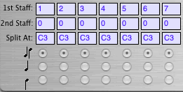 The bottom section of the MIDI Recorder allows the staff and voice for each track to be set. The staves in the score are identified by the Staff ID (which is the idnetification number that appears at the right edge of a staff). If you want the track divided between two staves, then indicate the second Staff ID and a split point. Notes above the split point will appear on the first staff and notes below the split point will appear on the second staff. (The split point is indicated as a note name and octave number - middle C is C3). You also set which of the three possible voices you want to transfer the track to. Normally the first voice will be selected unless you want to transfer two tracks to the same staff in which case you will set one track to have stems up and one track to have stems down.