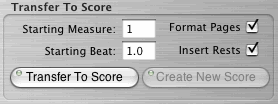 First, set the starting measure number and beat position for the transfer. This is where measure 1, beat 1 of your quantized recording will appear. You should also set whether you want the pages to be formatted and whether you want rests to added wherever appropriate. When you are ready to send the quantized recording to the score, click on the Transfer To Score button. If you now want to make a new recording, remember to clear the data currently in the tracks by clicking on the Clear buttons on all the active tracks.