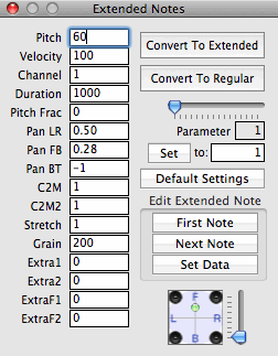 The Extended Note Panel provides a tool for embedding additional data in a note. This additional data is intended to be used in the Integrated Interactive Music Performance Environment (IIMPE) which has been developed by the author. Basically, the panel allows you to convert Regular notes into Extended notes (and vice versa) and to add a series of parameters (pitch fractions, panning locations, c to m ratios, etc.) to the extended notes. In a score, the extended notes are shaded in different colours (depending on the channel they are on), and will pass their data on to Max/MSP during playback. In the score example below, the black notes are regular notes, while the coloured notes are extended notes - they will only playback if the Track (staff) is set to Network or MIDI. Each of these notes can have a different panning location, pitch, pitch fraction (for microtones) etc. Obviously, a Max/MSP patch has to be built that will receive and correctly interpret the incoming data.