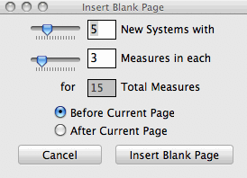 The Insert Blank Page... the menu item displays a panel which allows you to set the number of systems and measures in the new page and to indicate whether you want it placed after or before the current page.