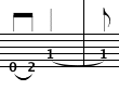 The Form Tie button can be used to create a tie between tablature numbers that are the same (i.e. the same string and fret). Select the numbers you want tied, and click on the Form Tie button. The duration of the first note is altered to include the duration of the second note. The example below shows a slur followed by a tie.