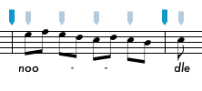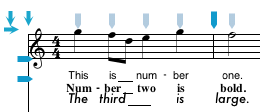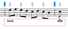 The Extend Underscore button extends an underscore from the first selected lyric image to the first selected note image. Underscore are used to indicate that syllables are held for more than one note (as in "third__" in the example above.) The Remove Underscore button removes all underscores that begin on the selected lyrics. In the example below, the lyric syllable and the last note in the passage were shift-selected, and the Extend Underscore button was clicked.