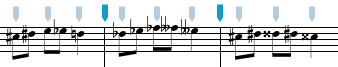 The Ficta On/Off item is used to alter selected notes to either use Musica Ficta or not. Musica Ficta refers to the placement of accidentals above the note rather than to the left of it; this method of positioning accidentals was common in Early Music. If needed regularly, Musica Ficta can be set as a preference (in the Other Tab of the NoteAbilityPro Preference panel). The example below shows a passage followed by the same passage using Ficta accidentals.
