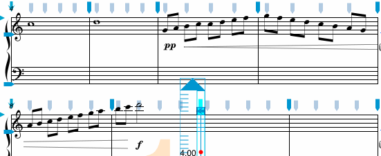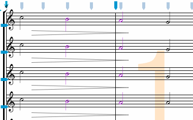 It is also possible to use these menu items to create crescendi or descrescendi across many staves. In this case, select several staves with the Select Score arrows by placing the start arrow on the first staff and the end arrow on the last staff that you want included. A crescendo or decrescendo will be added to each staff. The example below should make this clear: