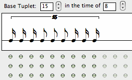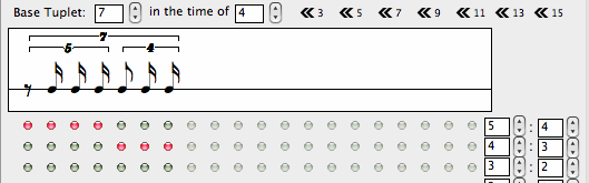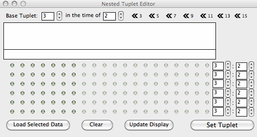 Click on the Set Tuplet button to cause the nested tuplet to be set in your score. The Update Display button causes the tuplet display to be refreshed, and the Clear button clears the current tuplet display so a new tuplet can be loaded.