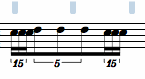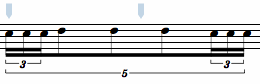 We enter the 3 sixteen notes, then switch to the quintuplet check box (since the middle three notes are 5 in the time of 4 - they have no subdivisions) enter the 3 eighth notes, then switch back to 15 in the time of 8 to enter the last 3 sixteenth notes. Tuplets will be formed - though these are all incomplete tuplets...