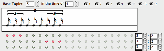 Next, click on the notes you want included in each nested tuplet and set the values of the nested tuplets. In this case, there are two separate nested tuplets -- both are 3 in the time of 2. Click on the first 3 buttons of the first row of buttons to link those 3 notes and click on the the last three buttons in the second row of buttons to for the second nested triplet. The values of the nested tuplets are already set to 3 in the time of 2 so you don't have to modify them. The panel should now look like this: