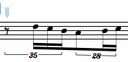 Below is a second, more complex example. In this case the base tuplet is 7 (16th notes) in the time of 4 and there are nested groups of 5 (16th notes) in the time of 4 and 4 (16th notes) in the time of 3. The actual rhythms include both sixteenth notes and eighth notes and there are some rests included in the passage. First, we calculate the duration of the first group -- which is (7 X 5) in the time of (4 X 4) or 35 in the time 16. We enter this value in the variable tuplet fields at the top of the score and enter a rhythm of eighth and sixteenth notes. The second tuplet group contains rhythmic values (7 X 4) in the time of (4 X 3) or 28 in the time of 12. We enter the remaining notes with this duration set. Once the notes are all entered, the passage should appear as: