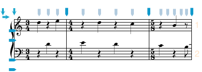Occassionally, the rhythmic spine may become distorted during system formatting. If this happens, you can rebuild the spine by clicking the Rebuild Spine Throughout Document or Rebuild Spine On This System buttons. As the buttons suggest, the first operation rebuilds the spine throughout the document while the second only rebuilds the spine on the system that the Entry Cursor is on. When rebuilding the spine, the Recalculate Measure Spacing radio button causes the measures re-spaced according to the meter, while the Retain Current Measure Spacing will rebuild the rhyhmic spine within each measure, but not adjust the size that the measure currently are. In the example below, the two radio button settings are used on a spine that was distorted because a number of Beat buttons were dragged out of order.