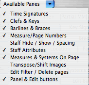 The Score Structure panel contains extensible rows of panes which can be used for modifying the underlying musical structure of your score or for performing some of the more advanced editing procedures. The pull-down menu at the top of the panel (entitled Available Panes) allows you to add or remove panes from the panel. A check mark in the pull-down menu indicates which panes are included in the pane and can be removed - the absense of a check mark means that pane can be added. A total of 10 panes can be stored in the Score Structure panel. In the example below, 7 panes are included in the panel.