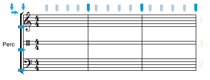 In the example below, a new two line staff (with the main label "Perc" and a percussion clef) was inserted above staff ID 2. Notice that the new staff has an ID of 3 since it was the third staff to be added to the score (despite the fact that it appears above Staff ID 2.)