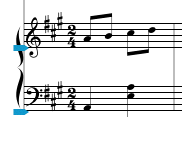 You might also want to adjust the distances between two piano staves in your score. This can be done several different ways in NoteAbilityPro, but we will start with the simpliest and most direct way. You can manually adjust the position of the second piano staff (in each system) by grabbing and dragging (in an upward direction) the button which is at the right edge of the bottom staff line. As you drag the staff, the position of the images on this staff will adjust. Move the bottom staff closer to the staff above in each of the three system