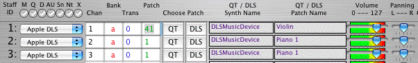 To set the DLS Synthesizer Instruments (or MIDI channels) for playback, Choose Track Setup... from the Audio-MIDI menu. In the Track Setup panel, you can set the patch number for DLS, Quicktime or MIDI playback. The General Midi patch for violin is 41 and for piano is 1. Set staff 1 to use Patch 41, and set staves 2 and 3 to use Patch 1. If you would like to choose a different DLS instrument, click on the DLS button for each of the staves, and a list of all available instruments will appear. Once set, the top of the Track Setup panel should look similar to the example below: