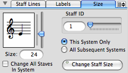 Make sure the Staff ID display shows 1 (since it is the first staff in the system we want to modify). Adjust the Staff Size slider until the display shows 18. (Since 24 points is the default image size, 18 points is about 75% of the original size). Since we want the entire violin part to be adjusted, make sure the All Subsequent Systems radio button is selected. Click on the Change Staff Size button.