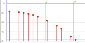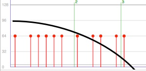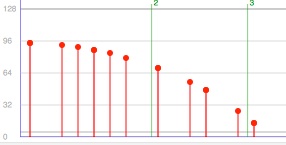 Clicking on the Load Notes button loads all selected notes into the panel where their playback velocities are displayed. All notes are displayed against a background which shows the measure numbers and barlines. The horizontal zoom of the display can be altered using the zoom in and zoom out arrows at the bottom of the panel. The example below shows a selected group of notes and its appearance in the Velocity Editor: