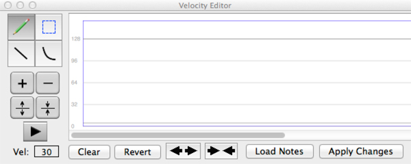 When you select the Velocity Editor... menu item, a panel appears that allow you to modify the playback velocities (i.e. volumes) of selected notes in your score. The panel can be used at any time and can be used to edit any quantity of notes -- from a small group of notes to an entire score.