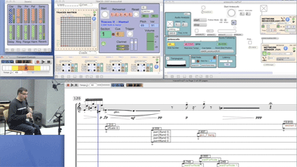 The top-left MaxMSP patch is running Antescofo, tracking the live clarinet performance and sending score location details