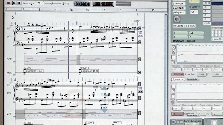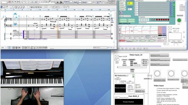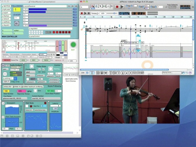 In the performance below, the motion of the pianists hands are used both to synchronize the performance to the score and to generate electroacoustic events. The pianist (Megumi Masaki)