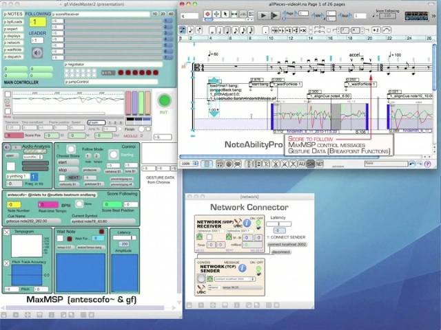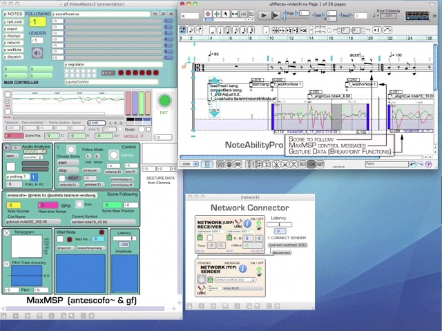 An example of a NoteAbilityPro score containing the score to be played by a live performer, MaxMSP control messages and gestures recorded from a 3-axis accelerometer.