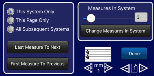 To change the number of measures on a system, select one of the three settings (This System Only, This Page Only or All Subsequent Systems) and