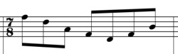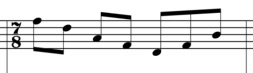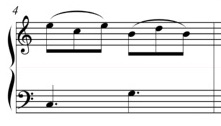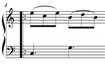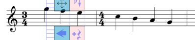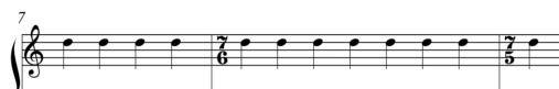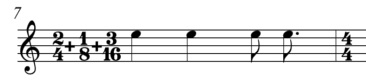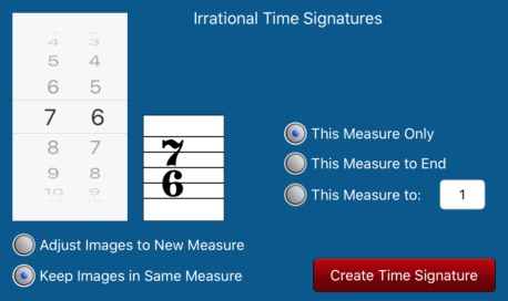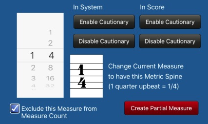 Partial Measure Pane ![]() The Partial Measure Pane allows you to create incomplete measures (as in the case of a pickup measure that has only 1 or 2 beats). As with the Time Signature Pane, you can elect to shift images affected by the change to new measures or keep them in the same measures, and you can indicate whether the partial measure should be included in the measure number count or not. In the example below, a 1 beat pickup measure was created and the measure not included in the measure count - so the following measure will be measure 1. ![]() ![]() The Enable Cautionary and Disable Cautionary buttons are used to enable or diable cautionary time signatures at the end of the current system or throughout the score. Cautionary time signature are time signatures that occur at the end of a system to indicate that there is a time signature change on the first measure of the next system: ![]() Beat Grouping Pane ![]() ![]() If we adjust the sliders to set beat groupings as 3/8 + 2/4 and touch the Set button ![]() the music will be beamed according to the new beat structure: ![]() If you want all measures with the same time signature in the score changed to this beat grouping, check the All Instances of this Meter button before touching the Set button. Irrational Time SignaturePane ![]() The Irrational Time Signature pane is for entering unusual time signatures that have denominators other than 1, 2, 4, 8, 16, or 32. These irrational time signatures are sometimes used in contemporary music in situation where you want a triplet or quintuplet rhythmic value to be the denominator of a time signature. For example, the time signature of 4/4 means that there are 4 beats and each beat is a quarter note - a time signature of 4/6 means that there are 4 beats and each beat is a triplet quarter note. Such a passage could not be entered using triplets since there are only 4 triplet quarter notes in the measure and the triplet grouping would not be completed. Essentially, a shift from a 4/4 measure to a 4/6 measure is a change of tempo by a factor of 6 / 4 (120 would become 180). While these time signatures are rare except in complex contemporary music, they have been included in NAPro for musicians that require them. There are check boxes on this panel which allow you to set the number of measures you want affected by the change and whether images should be adjusted to new measures or kept in the same measure they are currently in. The example below shows irrational times signatures of 7/6 and 7/5. ![]() Key Signature Pane ![]() The Key Signature Pane allows you to change the key signature beginning in the current measure. You can choose to change the key signature on only the current staff or on all staves in the system, you can have the set the portion of the score that is affected by the key signature change: