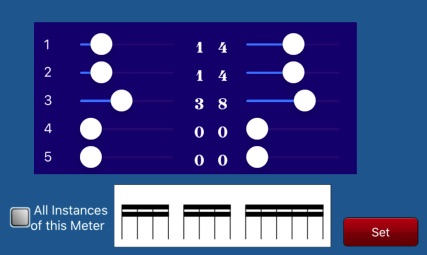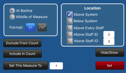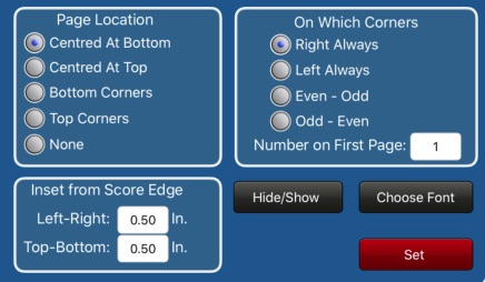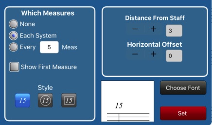 Once you have set the location and format of your measure numbers, touch the Set button to transfer your settings to the score. Page Number Pane ![]()