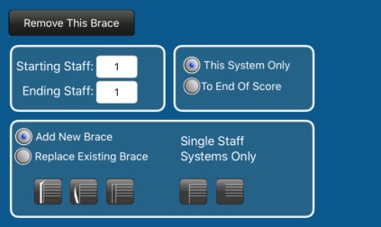 You can select whether the change occurs only on the current system or through until the end of the score. You can check the Replacing Existing Brace button and click on one of the brace buttons to change the current brace, or you can set the starting and ending staff numbers and check the Add New Brace button to add a brace to the left of the existing brace. In the example below, the system already had a straight brace and a thin line brace was added from staff 1 to 2 and a piano brace added from staff 3 to staff 4: ![]() For single stave systems, you can choose one of the two buttons on the panel to have a straight line brace or no brace: ![]() To remove a Brace that passes through the current staff, touch the Remove This Brace button. If there are more than one brace on the current staff, the left most brace is removed first. Measure Number Pane ![]() The Measure Number pane allows you to change the location and placement of measure numbers in the score. For the frequency with which measure numbers appear on the score you can choose: