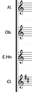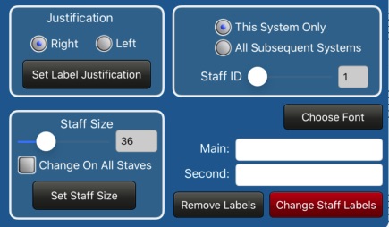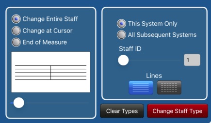 You can use the two buttons below the slider to set whether the staff lines are solid or dashed (unusual but possible) and choose whether the staff line change takes place for the entire staff, starts at the position of the Entry Cursor, or starts at the barline at the end of the current measure. Finally, you can have the change take place only in the current system or through to the end of the score. The staff ID slider simply shows the current staff ID and allows you to switch to other staves without leaving the panel. Once you have made your choices for the staff line changes, click on the Change Staff Type to change the staff lines. In the example below the staff lines were changed to a single dotted line for a couple of beats in the middle of the staff, by using the Change At Cursor option twice - once to start the single dotted line staff and once to switch back to the 5-line staff. ![]() Use the End of Measure option if you want your staff changes to be aligned with barlines so that you can create areas of your score with no staff lines: ![]() The Clear Types button will clear all the staff line changes on the current system and revert the staff to the configuration of the previous system. Staff Labels Pane ![]() ![]() The Staff Labels pane can also be used to change the size of the staff using the slider to set the point size of the staff. Most images on the staff (other text and graphics) will be adjusted to the new size. In the example below, the top staff (for the entire score) was changed from 36 point (the default size) to 28 point: ![]()