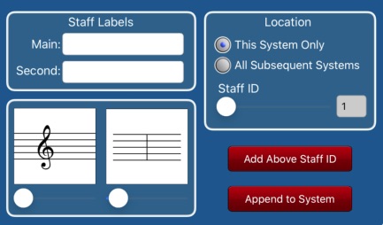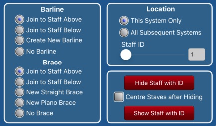 Staff Hide/Show Pane ![]() The Staff Hide/Show pane allows you to hide or show staves beginning on the current system. You can use the Staff ID slider to select which staff you want hidden or shown, and you can set whether the change occurs only for the current systems of through until the end of the score. When previously hidden staves are shown, you can use the Barline and Brace radio buttons to select whether they should: