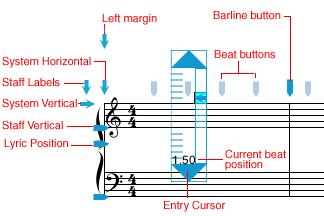 Notes and rests are entered at the beat location determined by the left edge of the Entry Cursor and indicated numerically at the bottom of the Cursor. The Entry Cursor can be moved with the Move Entry Cursor tool (on the Control panel), by dragging the Cursor by the vertical bar on the right side of the Cursor, by using the spacebar (forward) or Shift-key and spacebar (backward), or by holding down the Command key and clicking the mouse at a new location. In measures where notes have not yet been entered, the Entry Cursor can be placed at every .25 of a beat. In measures where notes and rests already appear, the Entry Cursor can be placed at every .25 of the beat and at any beat location where a note or rest already exists. A small red dot appears on the entry cursor when it is on a full beat position (as opposed to begin between beats.)