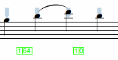 MIDI Controller messages involve two components - a controller number and a value. Some MIDI controller numbers default to Volume (7) Panning (10) Sustain Pedal (64) while others are dependent on the receiving synthesizer or sampler. Controller messages can be used in some Software Samplers (such as the Vienna Symphonic Library) to switch between instruments on a single channel. In some cases you may want to include controller messages for other purposes (eg to alter the panning position of the playback). To enter a Controller Message in use the command: ] followed by the controller number, a dash, and the controller value. For example, ]1-64 will set controller number 1 to 64, ]10-80 will set controller 10 to 80. MIDI Controller messages appear in green below the staff and will be sent to the instrument at its location in the score. In the example below, values of 64 then 0 are sent to controller number 1.