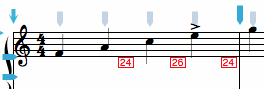Key Switches are essentially MIDI note messages (a note on followed very quickly by a note off) that are inserted in the score at any location. Software samplers can be configured to switch patches when a key switch is received. To enter a key switch in the score, use the command: [ followed by the midi key number either in decimal (0-127) or as a note name followed by and octave (c1, f#2, ab7). The number (expressed as a decimal value) is displayed in red at the base of the clef. In the example below the commands [c1 and [d1 were entered and the numbers 24 and 26 (their decimal equivalents) were added to the score. During playback these key switches will be sent between the notes in the score.