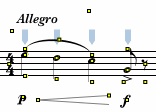Images with two dimensions such as notes (whose stem height changes), crescendo marks, trills, lines, etc. have two control points. Generally, the two control points are located at either end of the image (eg. at the note head and tip of the stem or flag on a note). Clicking on one of these Control Points will adjust the size or shape of the image (eg. dragging the right edge of a trill makes it longer.)