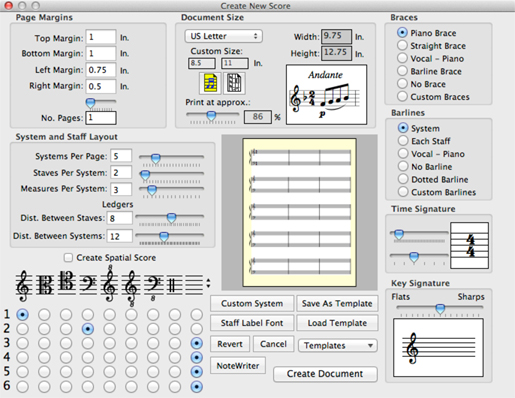 To create a new blank score, choose the New item from the File menu. A dialog box appears which allows you to describe the score layout (paper size, printing size, page margins, number of systems per page, number of staves per system, time signature, etc.)