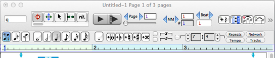 Along the top of the score, you will notice several important controls. These controls include the NoteAbilityPro Tool palette (which allows you to switch between operations such as entering images, editing images, entering text, etc.), the Command field (which indicates which image will be entered when the mouse button is clicked on the score), controls for moving from measure to measure or page to page in the score, and score playback controls. There are aslo buttons for choosing which voice the notes are to entered in, for adding accidentals to notes, and check boxes to indicate that notes or rests should be triplets or quintuplets.