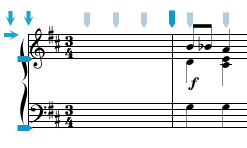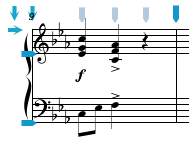 In most cases the placement of the Entry Cursor for pasting is intuitive, but there are some instances where it may not be obvious where to place the Entry Cursor when performing a paste operation. The basic rule is that the first note (or rest) found in the copied data is the image which will appear at the beat location and on the staff of the Entry Cursor when the paste is performed. All other images are positioned relative to this first image. In determining which note (or rest) is the first one selected, it is necessary to know that the data stored in the pasteboard voice by voice from the the top staff down through all the staves in the system. If there are no notes or rests in the selection to be pasted then the first image found will be placed at the Entry Cursor. In the example below, if the entire measure is copied, the first note will be the rest on the second beat of the top staff. Therefore, this rest will appear at the Entry Cursor when pasted, and the notes on the first beat of the second staff will appear on the staff below and on the beat before.