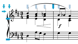 The Insert operation (invoked from the Edit menu) inserts the copied or cut data at the Entry Cursor after first shifting all the music from the Entry Cursor through to the end of the score to the right in order to make room for the paste. In calculating how much room is needed for the new music, only notes and rests are counted, and the music is shifted so that no overlapping will occur between the pasted notes and rests and those already in the score. If the following passage is copied, a total of three beats is calculated (even though the second staff only has two beats).