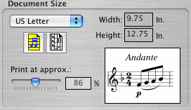 The Print View displays the approximate size of the images that will appear when the document is printed at the current reduction / enlargement size. As you become more familiar with NoteAbilityPro, you will know what print reduction / enlargement values are most appropriate for different types of scores.