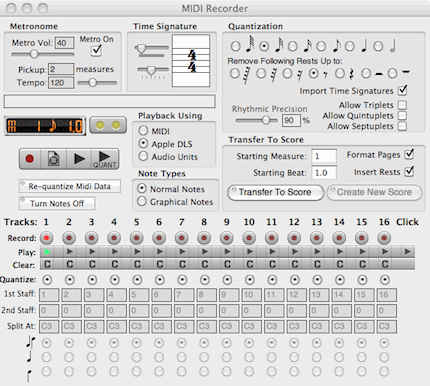 The MIDI Recorder is used for recording tracks from a MIDI keyboard and transferring them to your score. You can record up to 16 tracks, and can transfer the recorded material to any location in the score. Each track can be transferred to a single staff, or the track can be split between two staves (which need not be continguous). As well, you can specify which voice you want the track transferred to, so it is possible to transfer more than one track to a single staff.